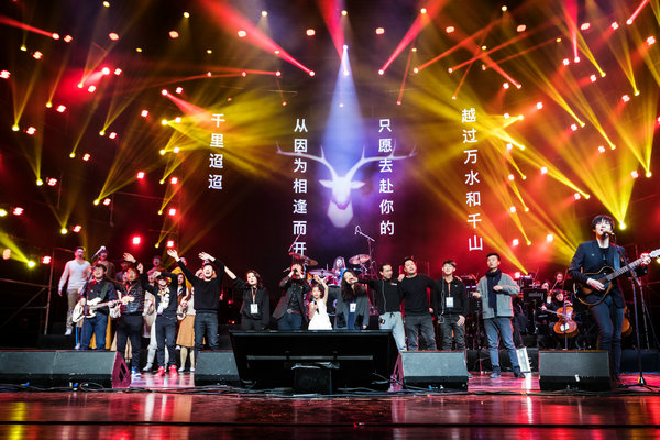 The indie band Sir Deer appears on stage together with staff members after a show at the Beijing Exhibition Center Theater in January. [Photo provided to China Daily]