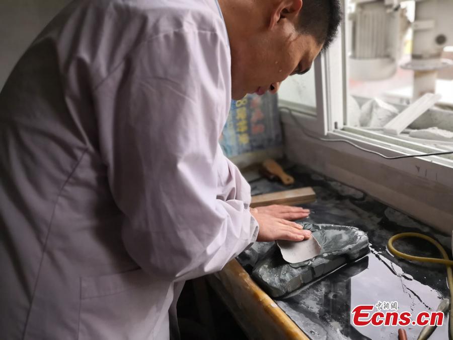 Huang Bingqiang puts the final touch on a Tao inkstone at Shangchuan village in Lanzhou city, Northwest China's Gansu province, March 21, 2018. Huang has been a dedicated maker of Tao inkstones for 15 years. With a 1,300-year-old history, Tao inkstones, made of stone found on the bed of the Tao River, is known as one of four famous inkstones in China and favored by traditional Chinese scholars. Huang needs up to ten days to finish a Tao inkstone, an act that involves tens of time-consuming steps. [Photo/China News Service]