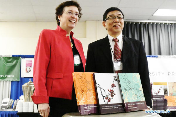 Jennifer Crewe (Left), director of the press affiliated with renowned Columbia University, and Cai Zongqi, professor of Chinese and Comparative Literature of the Department of East Asian Languages and Cultures, University of Illinois at Urbana-Champaign, pose for photos at the launch ceremony of the book series titled "How to Read Chinese Literature" in Washington DC, the United States, on March 23, 2018. The Columbia University Press launched a book series titled "How to Read Chinese Literature" here on Friday, with an eye to transforming the learning and teaching of Chinese literature, language, and culture in the English-speaking world. [Photo/Xinhua] |