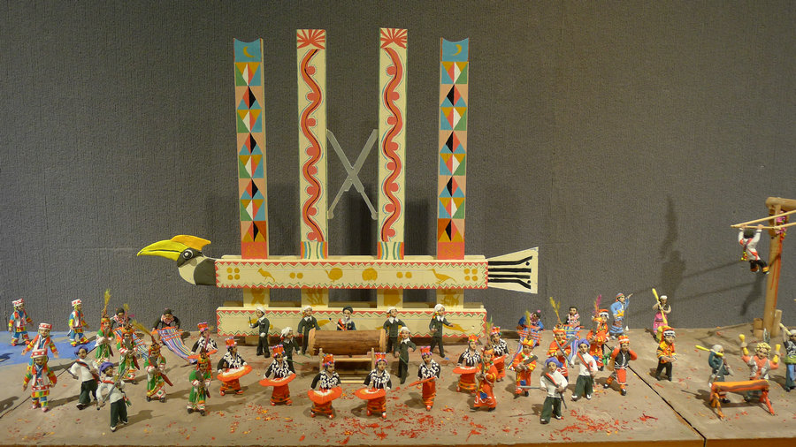 The composition "Our Holiday" made up of thousands of large dough models in festive clothing and poses, appears in the Kunming City Museum for the first time. It took eight folk artists one year to build the variety of characters and scenes for the entire work, which is up to 18 meters long. [Photo/Kunming City Museum]