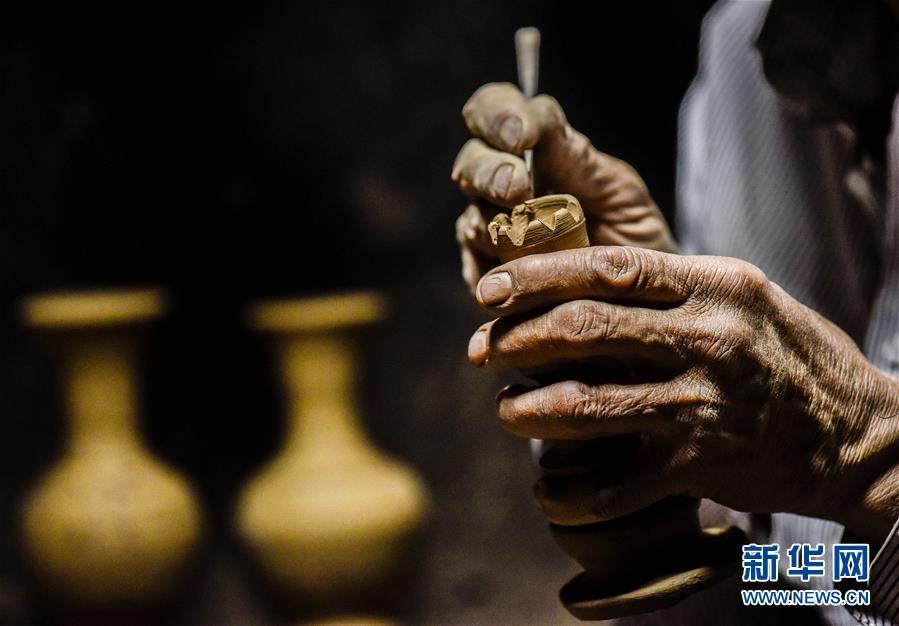 Tursun Zunum makes an earthenware vase at his studio in the old town of Kashgar, Xinjiang Uygur autonomous region, on March 16, 2018. [Photo/Xinhua]