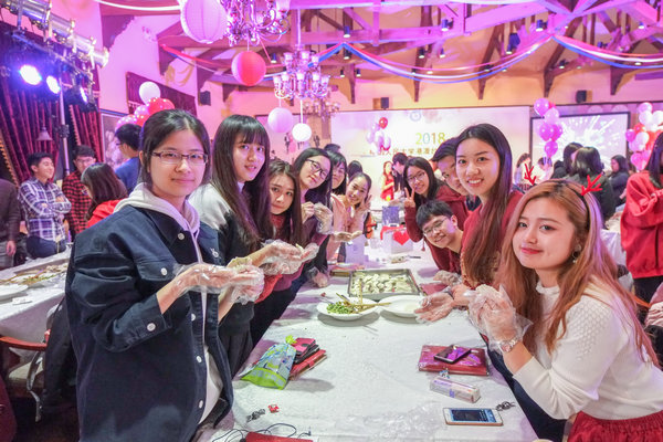 Students wrap dumplings at a New Year party. [Photo provided to China Daily] |