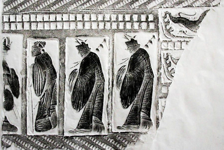 The rubbing of a brick portrait at the China Qingdao Han Portrait Brick Museum depicts a group of diplomatic envoys in the Han Dynasty. [Photo/Chinaculture.org] |