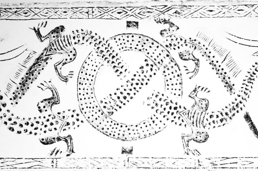 The rubbing of a brick portrait at the China Qingdao Han Portrait Brick Museum depicts two intertwined dragons. [Photo/Chinaculture.org] |