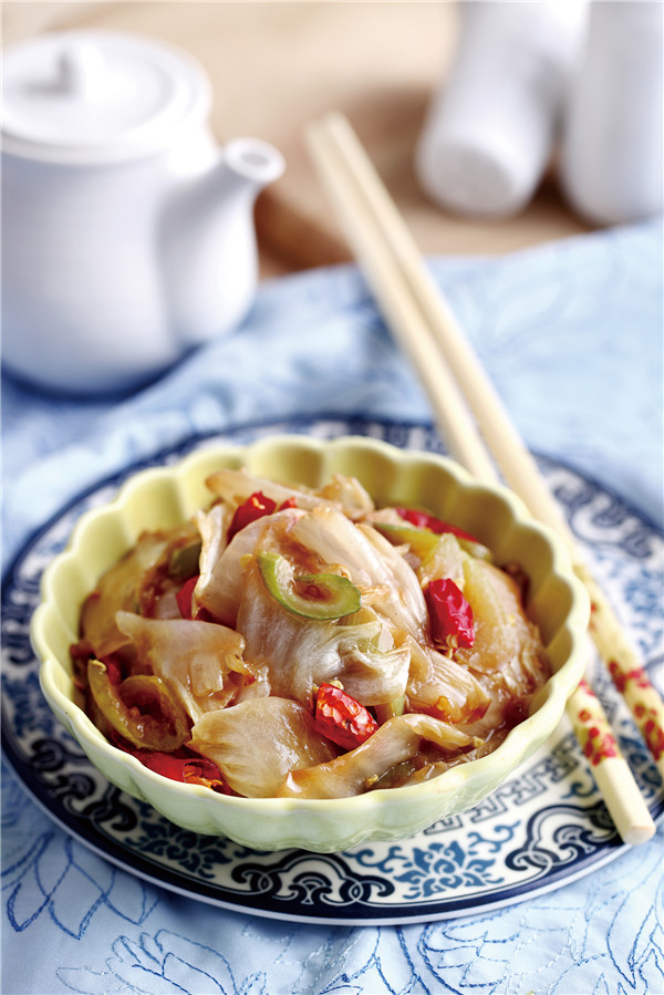 Stir-fried cabbage with vinegar and dried pepper. [Photo provided to China Daily] |
