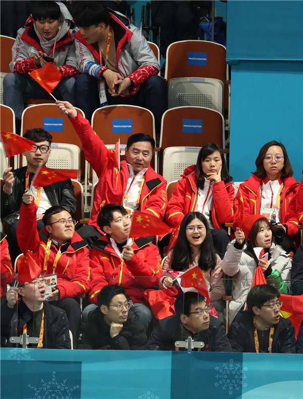 Members of the Chinese delegation cheer on Team China at the final of wheelchair curling at the Gangneung Curling Centre in South Korea. [Photo provided to China Daily] |