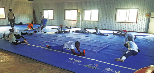 Students of the Chinese Wushu School in Monrovia, Liberia, stretch during daily practice. [Photo provided to China Daily] |