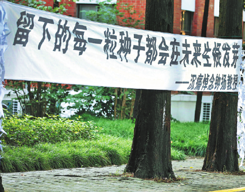 The banner mourning the death of Zhong Yang in a schoolyard of Fudan University on Sept 26, 2017. [Photo by Feng Ai/Xinhua]