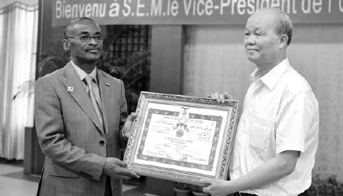 Professer Li Guoqiao receives the Order of the Green Cross of the Comoros from Fouad Mohadji, vice-president of Comoros. [Photo provided to China Daily]