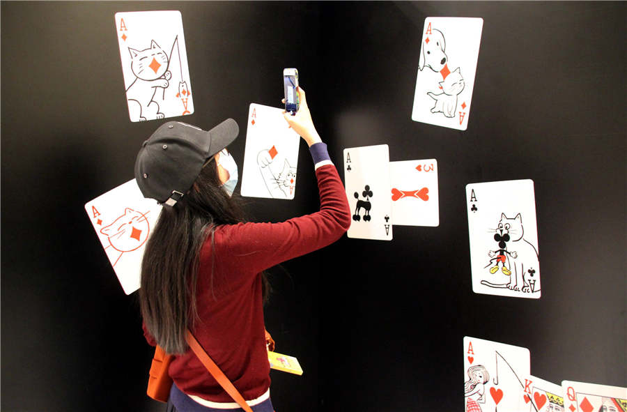 A visitor takes a photo of a cartoon by Gao Youjun at an exhibition in Suzhou, Jiangsu province on April 8, 2018. [Photo by Wang Jiankang/Asianewsphoto]