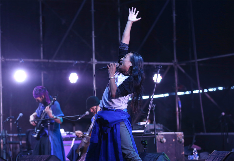 Singers from the band Kawa from Yunnan province and Rid from the Inner Mongolia autonomous region perform at Yangxin's world-music festival. [Photo by Zou Hong/China Daily]
