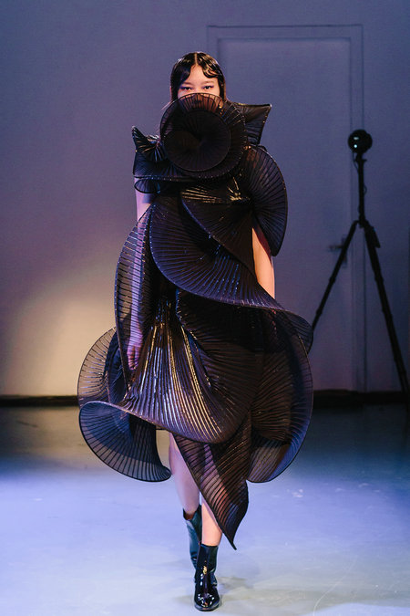 Another young talent Huang Shasha saw her designs on the runway for the first time. She presented a series of styles inspired by her experience making nets for the local fishermen in Xiamen, East China's Fujian province.
