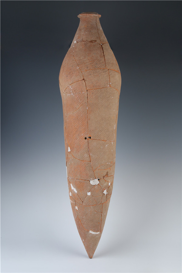 Yangguanzhai relics in Xi'an, Shaanxi province -- Yangshao culture, about 5,000 years ago. This photo shows a bottle found at the Yangguanzhai site. [Photo provided to China Daily] |