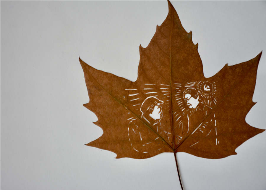 A leaf carving piece by Li Kai.[Photo provided to chinadaily.com.cn]