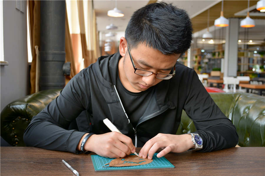 Li Kai works on a leaf carving work. [Photo provided to chinadaily.com.cn]