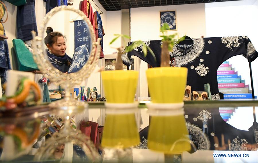 Li Andi arranges goods at her shop in Changchun, Northeast China's Jilin province, April 11, 2018. Li studied folk arts and crafts design and graduated from Jilin Agricultural University in 2006. Since 2015, she has started to research shaman culture and designed related products at her studio. She opened a maker shop in Changchun in March 2018 and wants to protect the traditional shaman culture through her product design. [Photo/Xinhua]