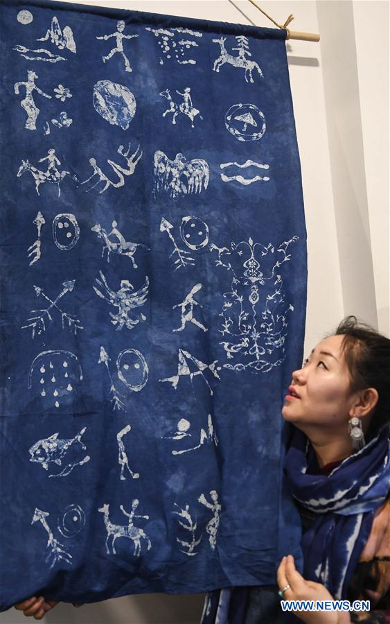 Li Andi shows shaman-themed marks on cloth in Changchun, Northeast China's Jilin province, April 11, 2018. Li studied folk arts and crafts design and graduated from Jilin Agricultural University in 2006. Since 2015, she has started to research shaman culture and designed related products at her studio. She opened a maker shop in Changchun in March 2018 and wants to protect the traditional shaman culture through her product design. [Photo/Xinhua]