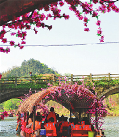 Peach flowers are everywhere in Toahuayuan, and are even used to decorate sightseeing boats. [Photo provided to China Daily] |
