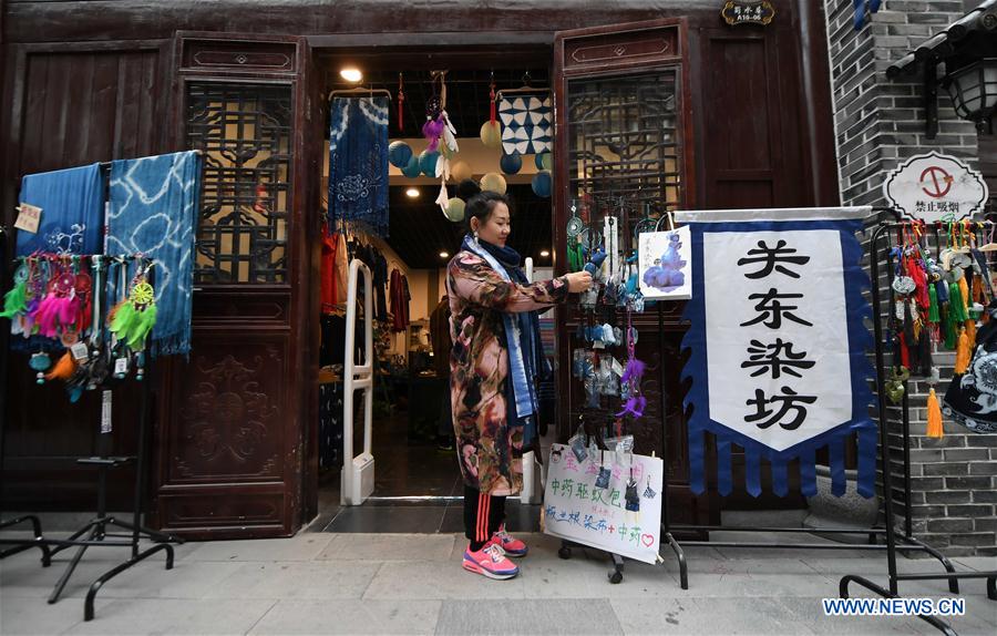 Li Andi arranges goods at her shop in Changchun, Northeast China's Jilin province, April 11, 2018. Li studied folk arts and crafts design and graduated from Jilin Agricultural University in 2006. Since 2015, she has started to research shaman culture and designed related products at her studio. She opened a maker shop in Changchun in March 2018 and wants to protect the traditional shaman culture through her product design. [Photo/Xinhua]