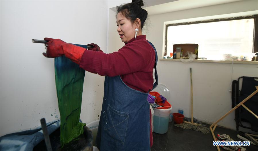 Li Andi colors cloth at her shop in Changchun, Northeast China's Jilin province, April 11, 2018. Li studied folk arts and crafts design and graduated from Jilin Agricultural University in 2006. Since 2015, she has started to research shaman culture and designed related products at her studio. She opened a maker shop in Changchun in March 2018 and wants to protect the traditional shaman culture through her product design. [Photo/Xinhua]