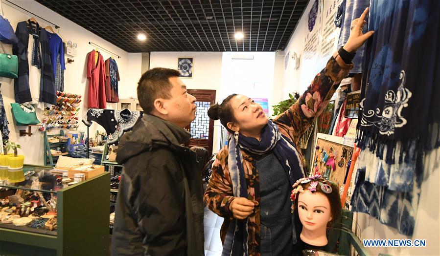 Li Andi and her husband arrange goods at Li's shop in Changchun, Northeast China's Jilin province, April 11, 2018. Li studied folk arts and crafts design and graduated from Jilin Agricultural University in 2006. Since 2015, she has started to research shaman culture and designed related products at her studio. She opened a maker shop in Changchun in March 2018 and wants to protect the traditional shaman culture through her product design. [Photo/Xinhua]