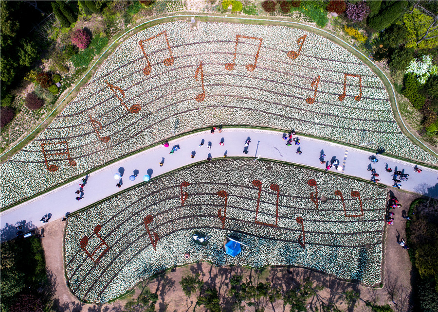 Musical notation shaped tulip flower field in Shanghai's Daning Park. [Photo by Niu Yixin/For China Daily]
