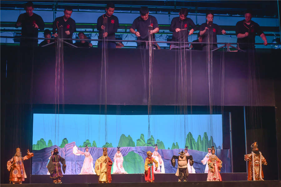 Actors born in 1990s answer a curtain call after a traditional puppet show at a theatre in Quanzhou, Southeast China's Fujian province, April 14, 2018. Young actors born in 1990s have become an important part in inheriting traditional puppet show here in Puppet Troupe of Quanzhou. [Photo/Xinhua]