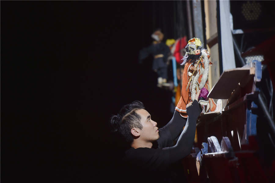 An actor born in 1990s performs a traditional puppet show at a theatre in Quanzhou, Southeast China's Fujian province, April 14, 2018. [Photo/Xinhua]