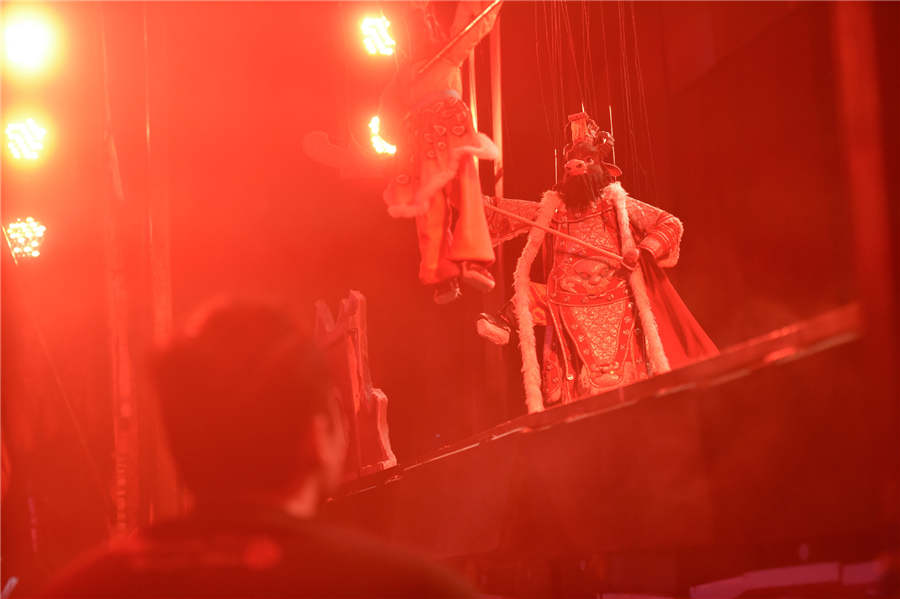 An actor born in 1990s watches a traditional puppet show at a theatre in Quanzhou, Southeast China's Fujian province, April 14, 2018. [Photo/Xinhua]