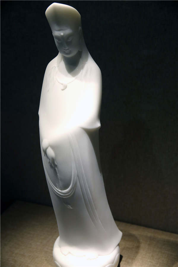 A marble Guanyin statue by Ma Tengyuan. [Photo by Jiang Dong/China Daily]
