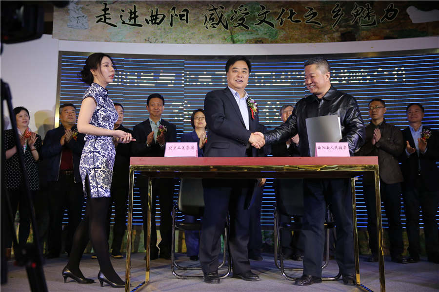 Beijing Arts and Crafts Group and Quyang county government sign a strategic cooperation agreement. [Photo by Jiang Dong/China Daily]