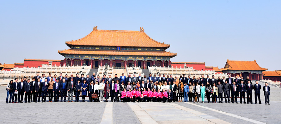 Participants both at home and abroad take a group photo at the Palace Museum on April 16, 2018. [Photo by Zhang Xingjian/chinadaily.com.cn]