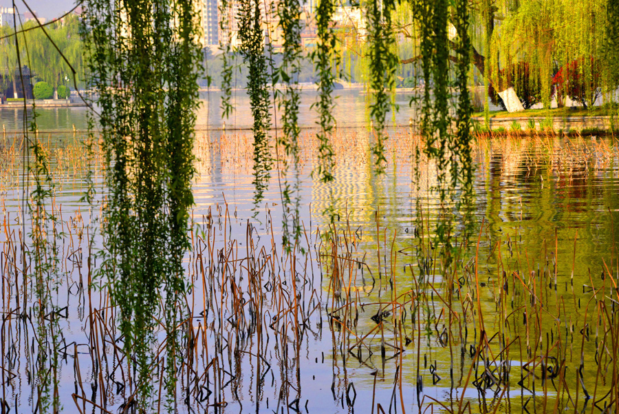 The photo, taken in April, shows the view of Daming Lake in Shandong province. New leaves of weeping willows are reflected on the lake’s surface, making the lake look like a colorful oil painting. [Photo by Ju Chuanjiang/for chinadaily.com.cn]