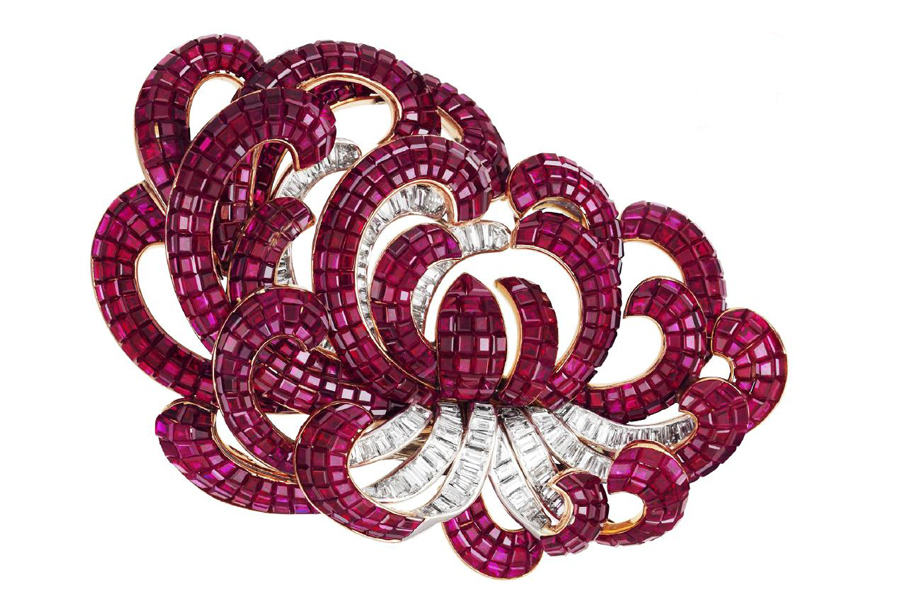 Chrysanthemum clip (gold, platinum, Mystery Set rubies, diamonds), 1937. [Photo provided to chinadaily.com.cn]
