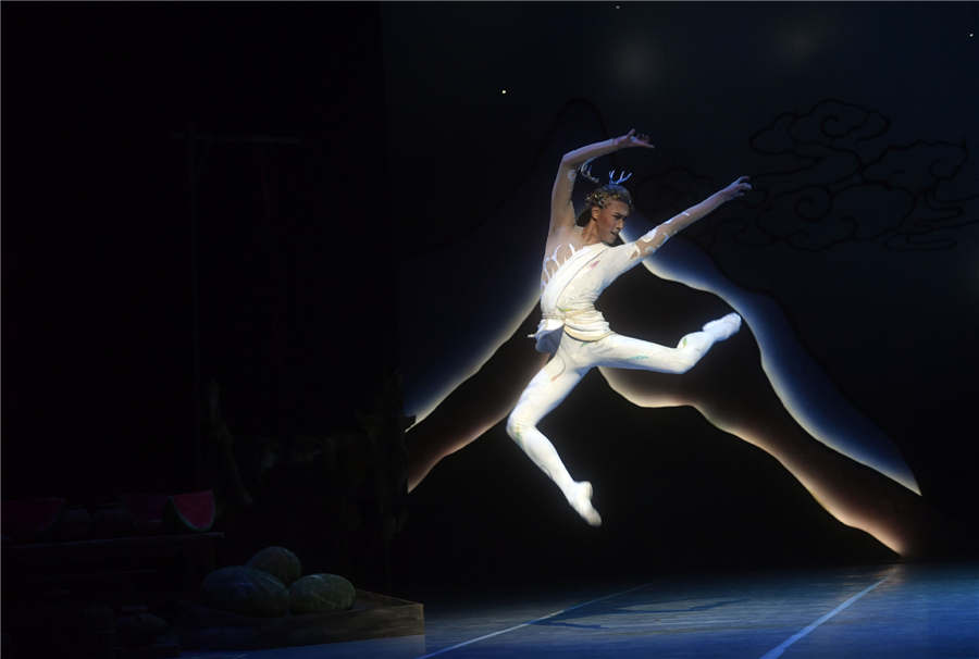 Dancers of the National Ballet of China perform "The Nine-colored Deer" at Tianqiao Performing Arts Center in Beijing, capital of China, April 23, 2018. The ballet told the story about a king deer drew on the walls of Dunhuang Mogao Grottoes locating at a cultural and religious crossroads area on the ancient Silk Road in Northwest China's Gansu province. [Photo/Xinhua]