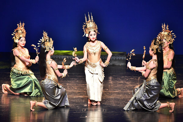 With a giant LED screen presenting a panoramic view of the mysterious Angkor Wat and Cambodia's natural scenery, dancers from the Royal Ballet of Cambodia appeared onstage in Beijing on Saturday. The dancers' graceful hand gestures, dazzling costumes and subtle, powerful choreography made it hard for audience members to take their eyes away from the performance.