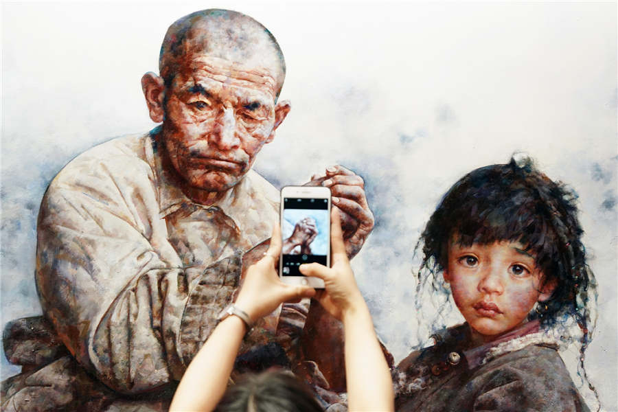 A visitor takes photo of an oil painting at the Art Beijing 2018 exhibition in Beijing on April 30, 2018. [Photo/Xinhua]