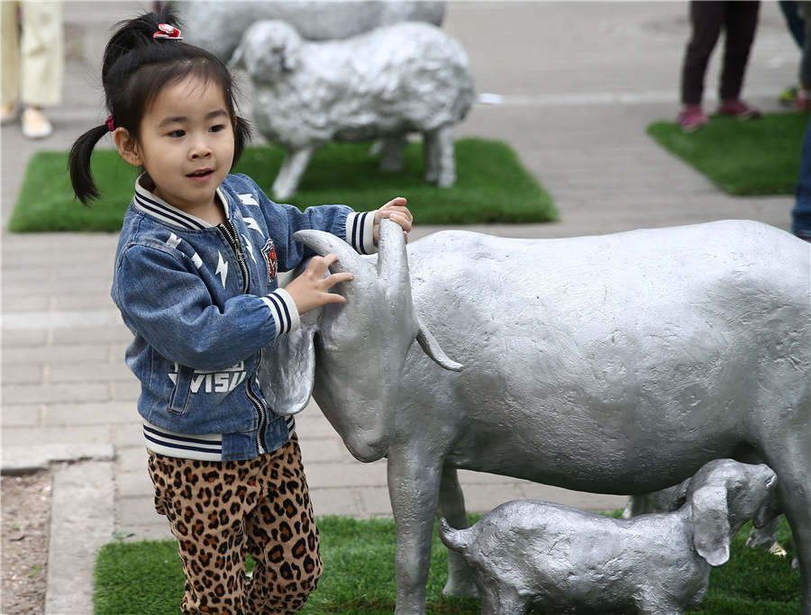 A child touches a sculpture at the Art Beijing 2018 exhibition in Beijing on May 1, 2018. [Photo by Zou Hong/Asianewsphoto]