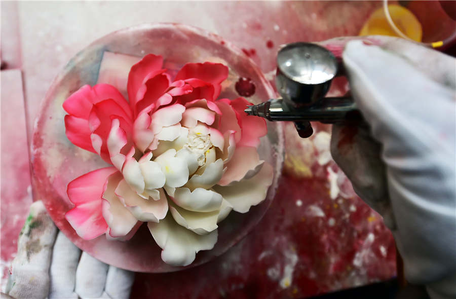 A worker colors a porcelain peony at a workshop in Luoyang city, Henan province, on April 30, 2018. [Photo by Huang Zhengwei/Asianewsphoto]