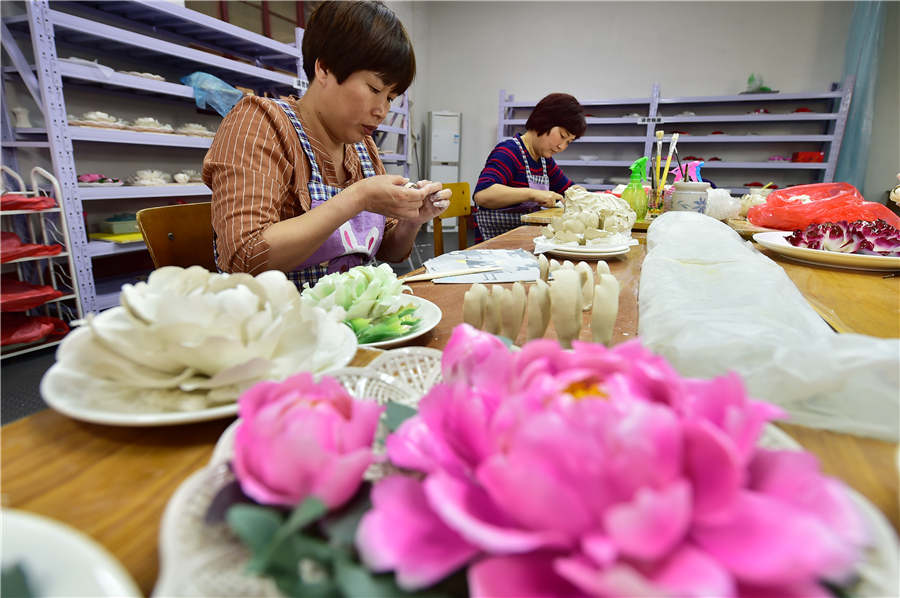 Workers knead peony petals at a workshop in Luoyang city, Henan province, on April 30, 2018. [Photo by Huang Zhengwei/Asianewsphoto]
