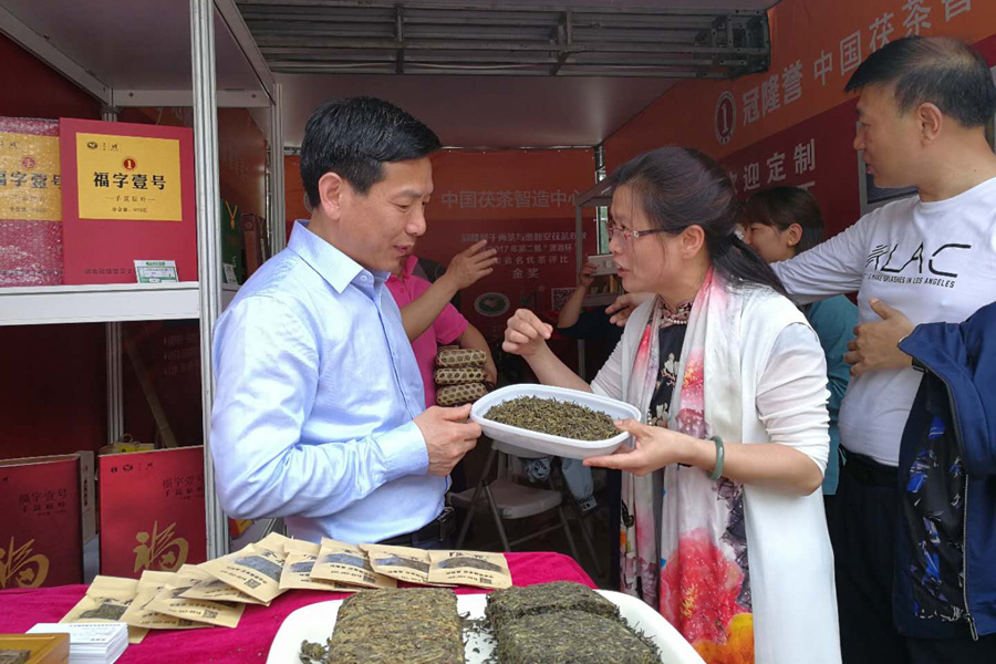 A tea company representative introduces dark tea products to Xiong Zhewen, Anhua's Party secretary. [Photo provided to chinadaily.com.cn]