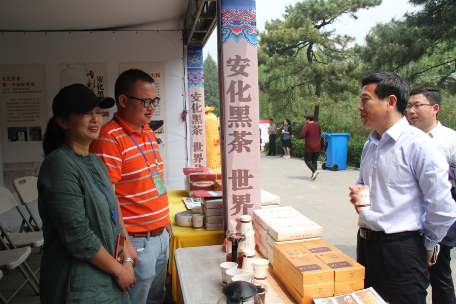 Customers inquire about dark tea at the booth of Hunan Axiangmei Tea Industry in Beijing on April 28, 2018. [Photo provided to chinadaily.com.cn]