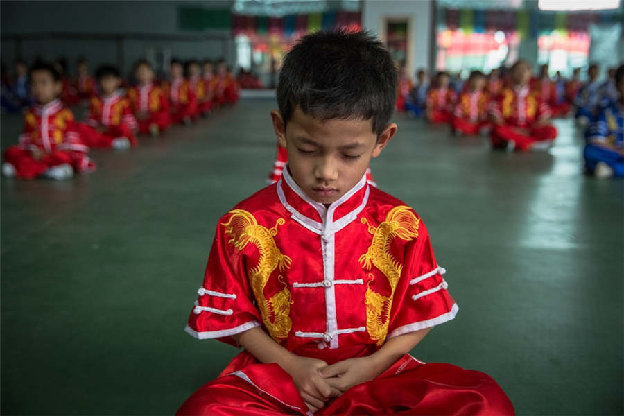 A group of children practice tai chi at a martial arts training base in Gu'an county, Hebei province, on June 10, 2017. [Photo by Roman Pilipey/provided by photoint.net]