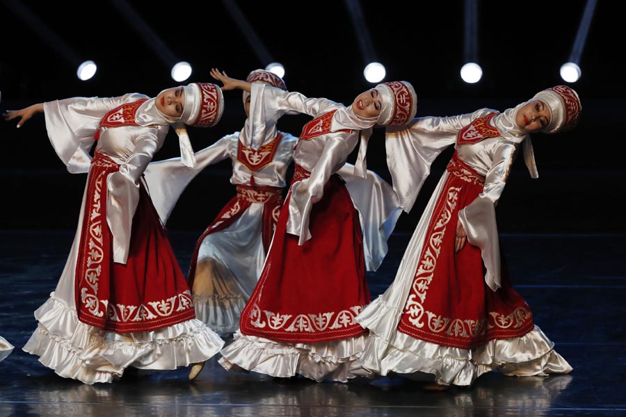 Migration of Nomadic People by Kyrgyzstan's national dance troupe "Semetey" showcases the nomadic life of the Kyrgyz people searching for water and pastures in the vast Asian land. [Photo/Xinhua]