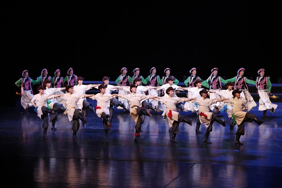 Students from Beijing Dance Academy perform at a dancing piece in the ethnic style of Zang people in Tibet. With afterglow of the setting sun still shimmering over the sky, young Tibetan people are celebrating the end of a day's hard work with songs and dances, surrounding the bonfire. [Photo/Xinhua] |
