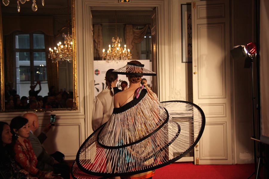A models shows a silk dress at the Paris China Cultural Center on June 5, 2018. [Photo provided to Chinaculture.org]