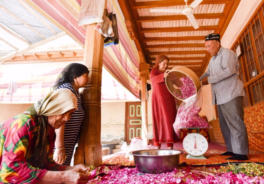 Flower grower Ruz and his wife Tajinisa weigh rose petals used for making rose sauce at a village in Hotan, northwest China's Xinjiang Uygur autonomous region, on June 6, 2018. Roses are now in the end phase of their life cycle, but Ruz can still harvest more than five kilograms of fresh rose petals every two or three days. People here specialize in making rose sauce from these fragrant flowers, which has become a vital source of income for local people.[Photo/Xinhua]