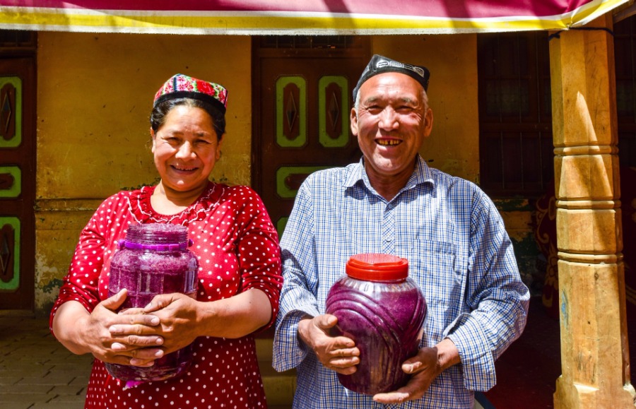 Flower grower Ruz and his wife Tajinisa show their handmade rose sauces at a village in Hotan, northwest China's Xinjiang Uygur autonomous region, on June 6, 2018. Roses are now in the end phase of their life cycle, but Ruz can still harvest more than five kilograms of fresh rose petals every two or three days. People here specialize in making rose sauce from these fragrant flowers, which has become a vital source of income for local people.[Photo/Xinhua]