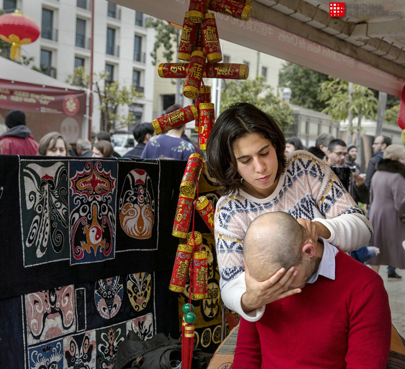 2018年2月11日,在葡萄牙首都里斯本市,Martim Moniz馬丁莫尼斯廣場(chǎng),葡萄牙人體驗(yàn)葡萄牙當(dāng)?shù)丶紟煹默F(xiàn)場(chǎng)中醫(yī)理療手法。[攝影:鄭英杰]