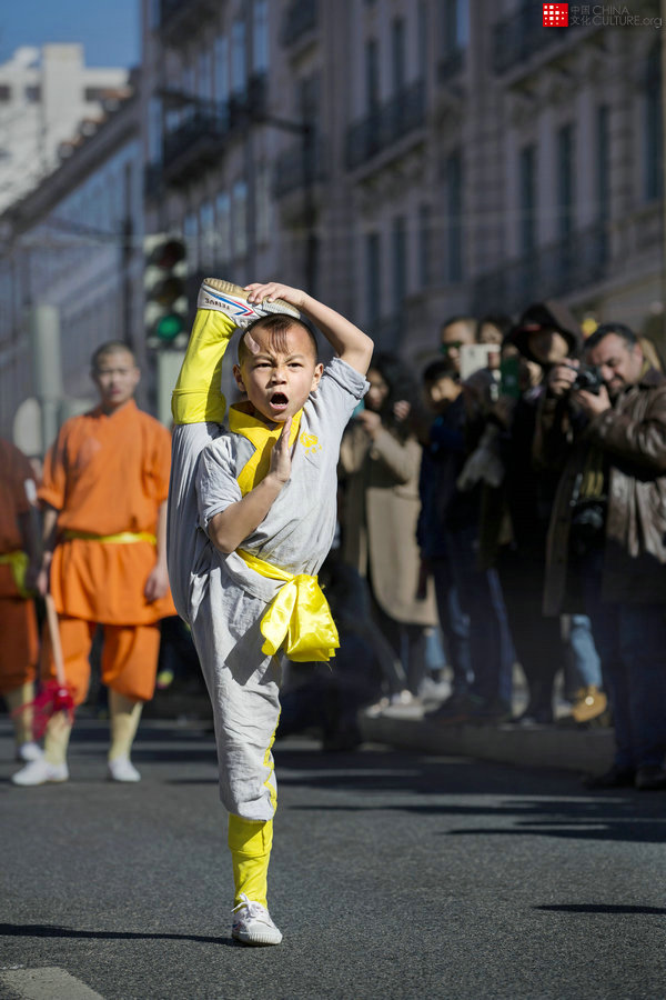 2018年2月10日,在葡萄牙首都里斯本市,來(lái)自少林寺的小武僧高幸福在游行時(shí)表演中國(guó)功夫。[攝影:鄭英杰]